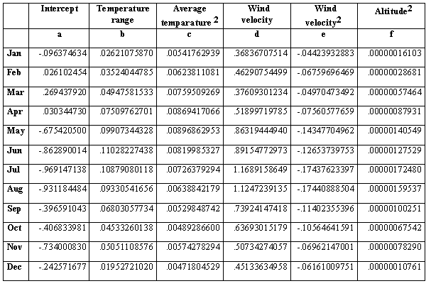ETo = a + (b ´ Est) + (c ´ T2) + (d ´ VelV) + (e ´ VelV2) + (f ´ Alt2)