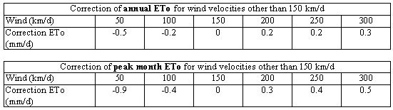 7 - a table was prepared to correct ETo for wind velocities other than 150 km/d: