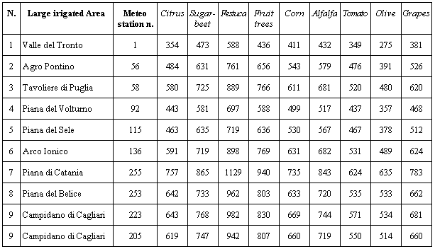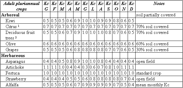 The crops are the main crops grown in Southern Italy, according to ISTAT statistics (1998). Kc values have been established on the basis of various sources (Doorenbos and Pruitt, 1977; Snyder, 1999; Pereira and Allen, 1999) and the authors' personal experience. Kc data have only one decimal figure and the crops have been as far as possible grouped.