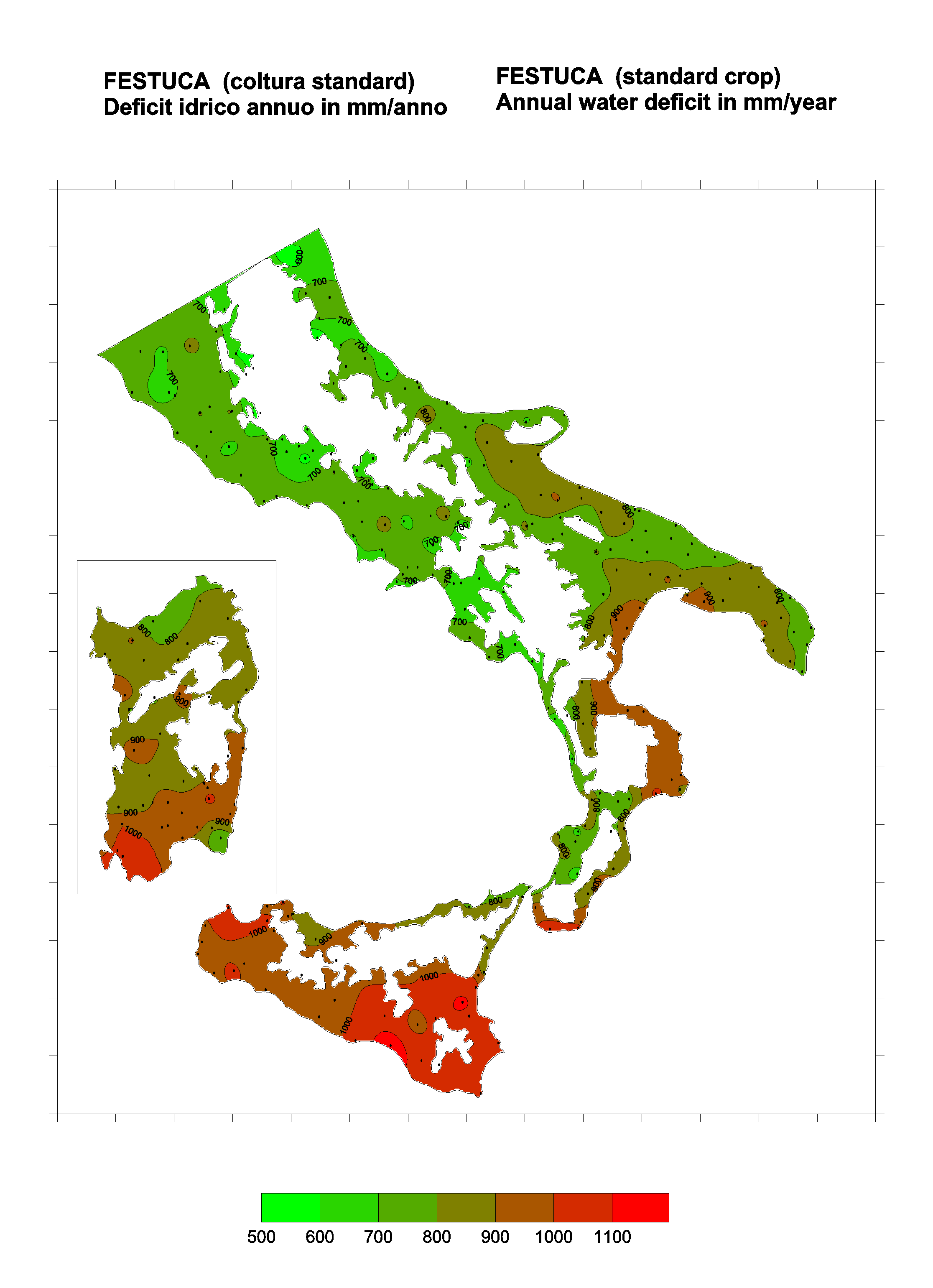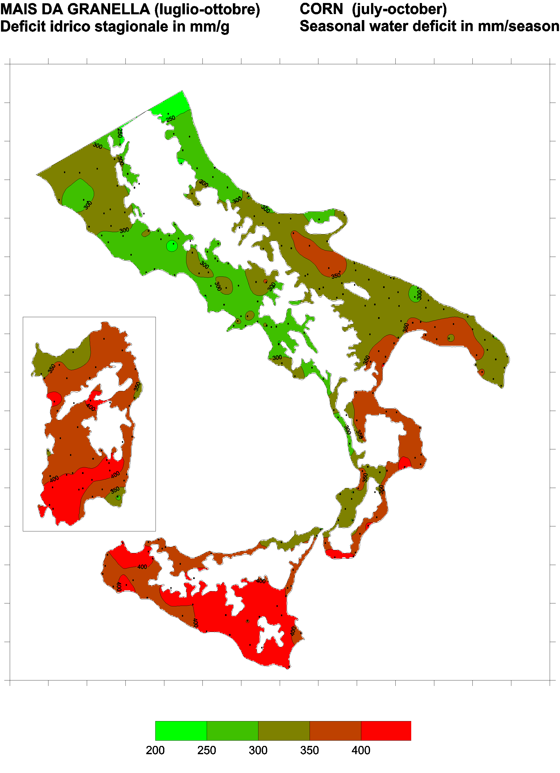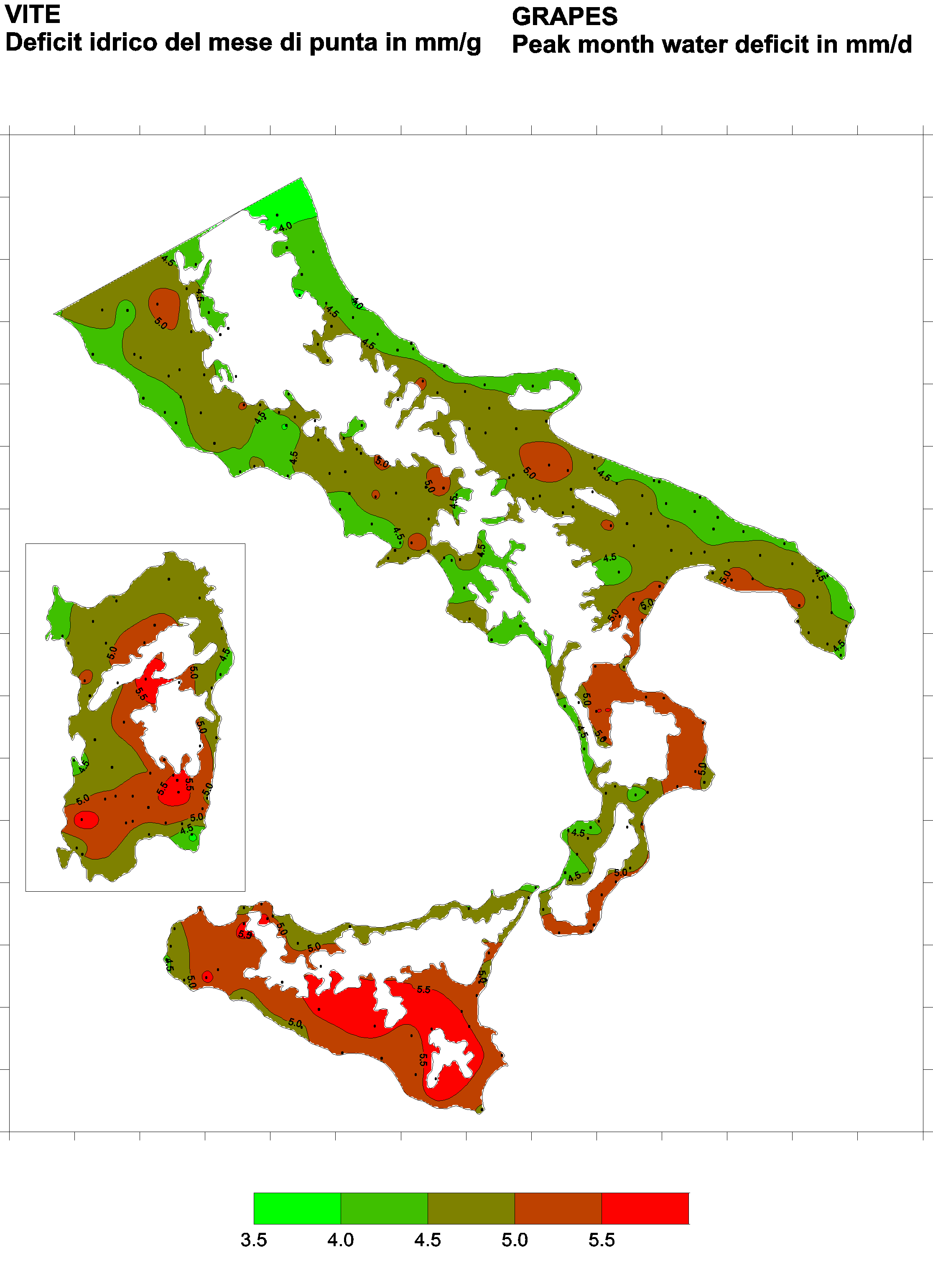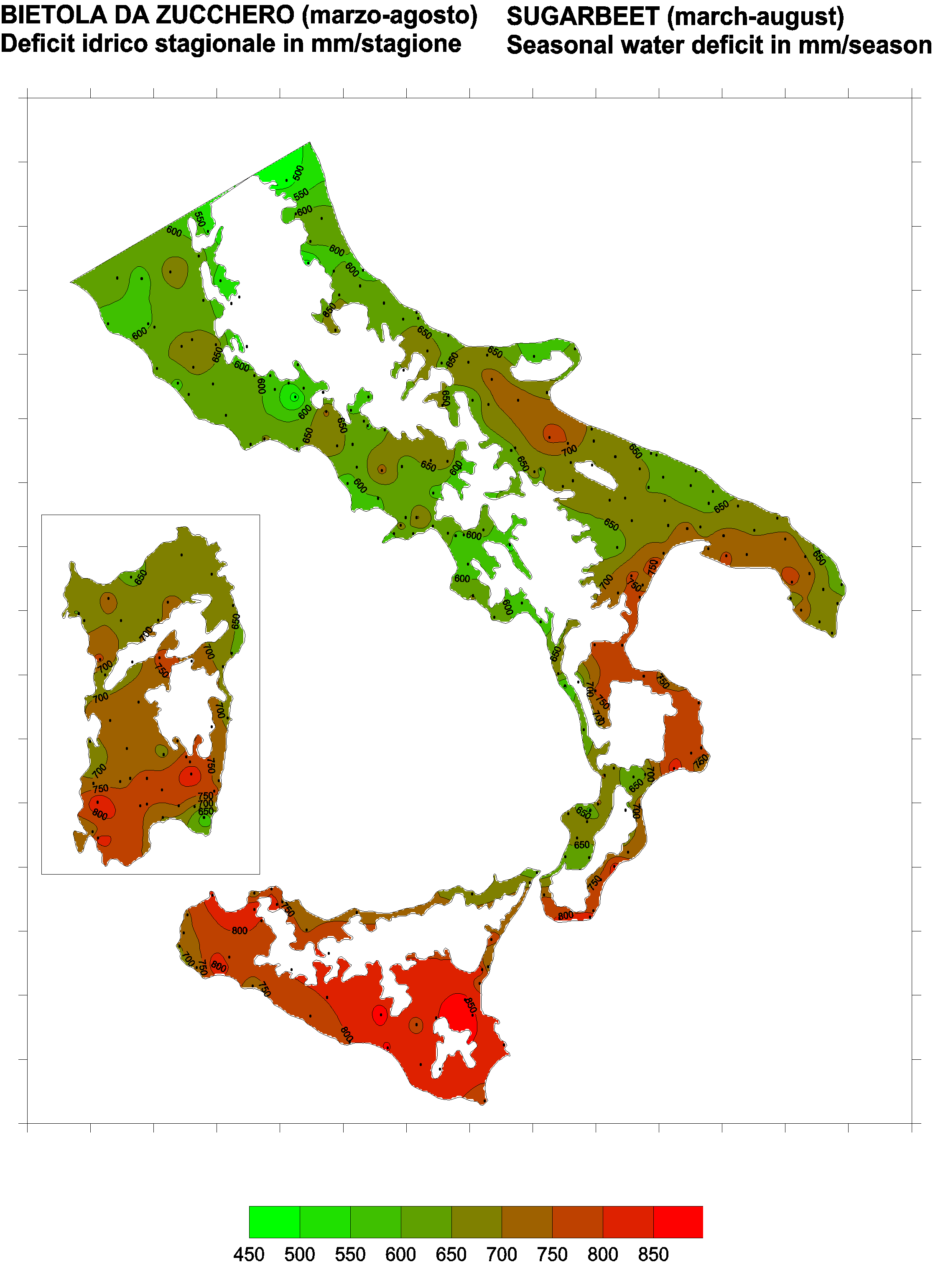 The water deficits mapped refer to a selection of crops cultivated in the periods of the year typical of Southern Italy. Deficits may vary considerably according to different periods and cultivation criteria.