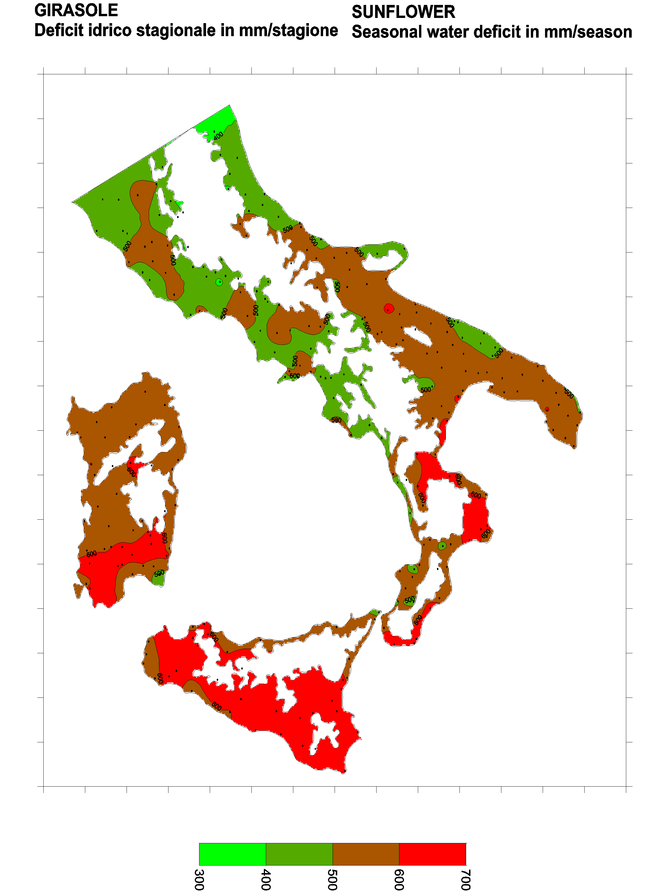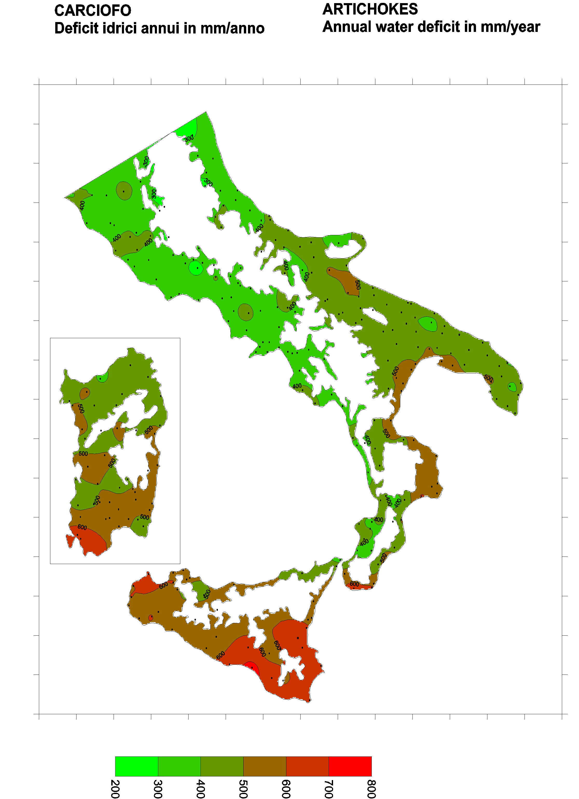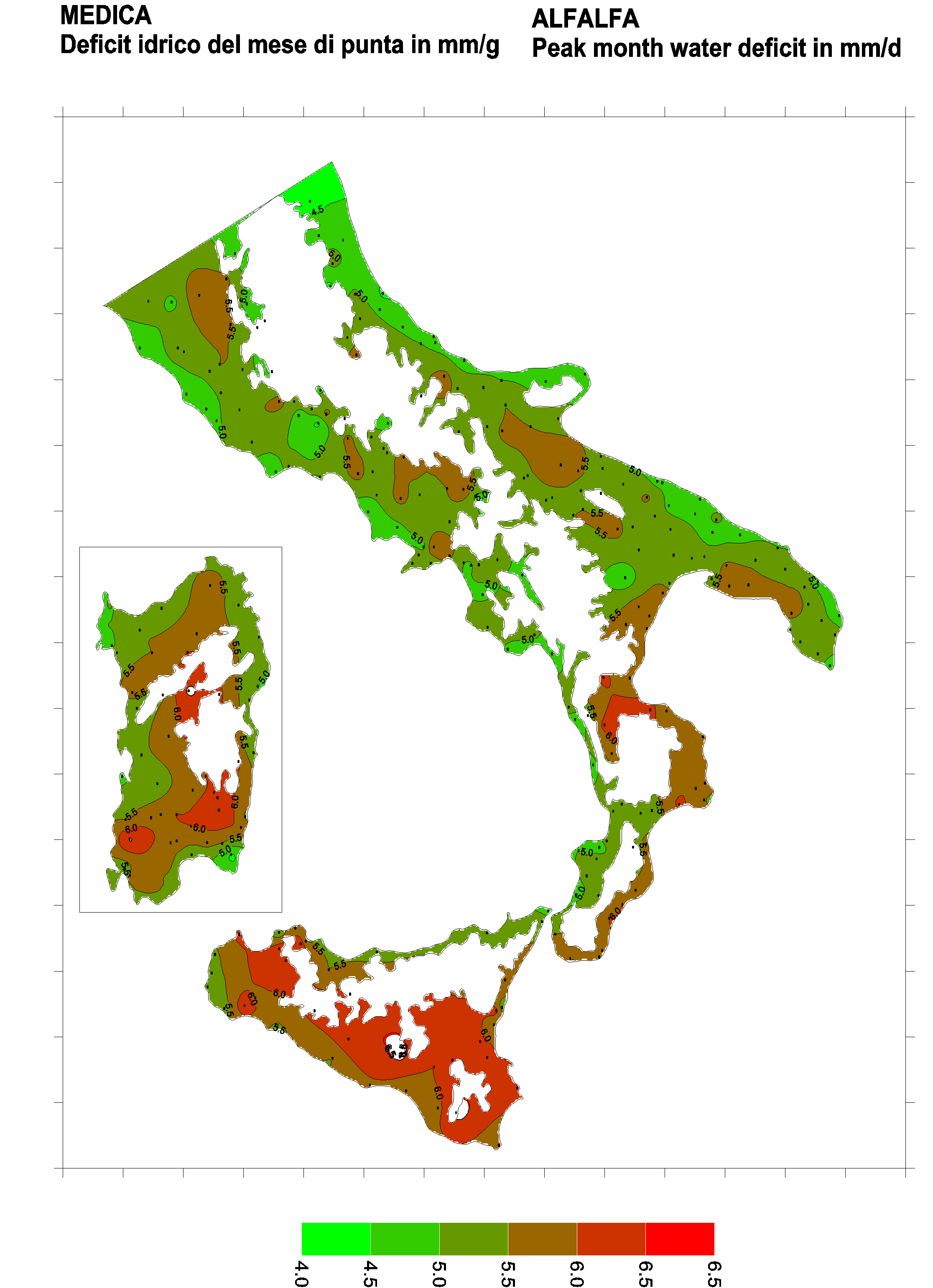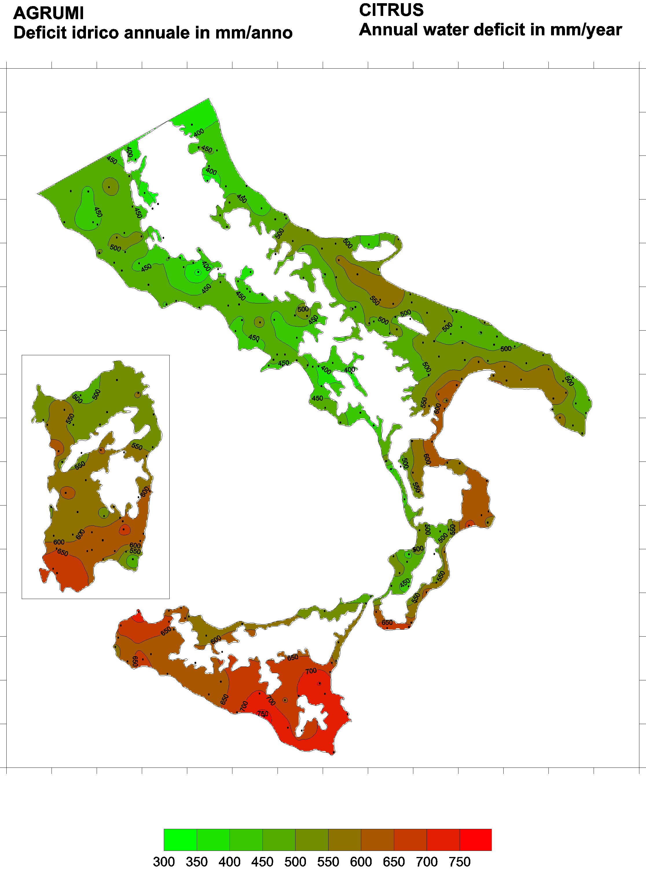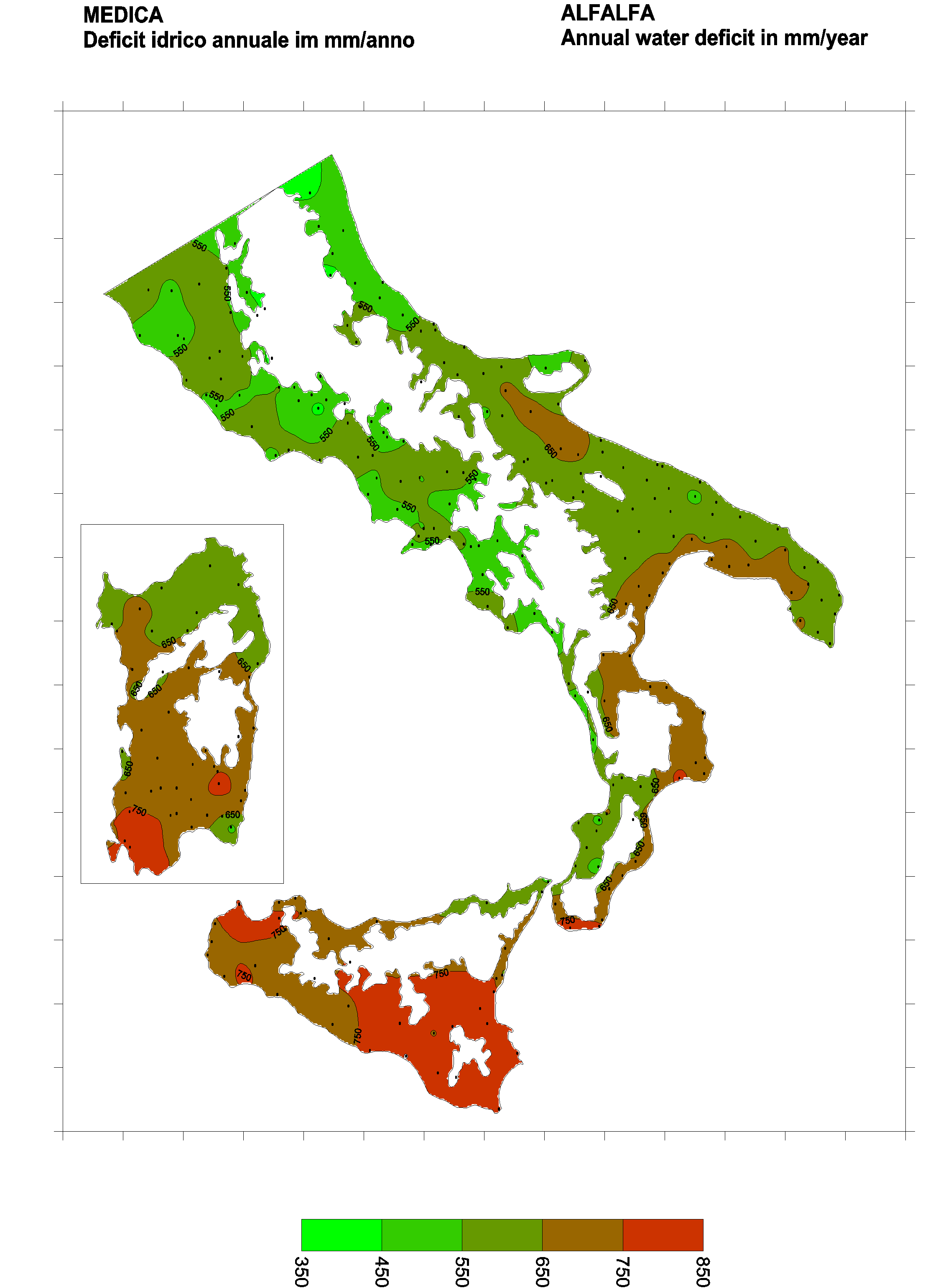 The water deficits mapped refer to a selection of crops cultivated in the periods of the year typical of Southern Italy. Deficits may vary considerably according to different periods and cultivation criteria.