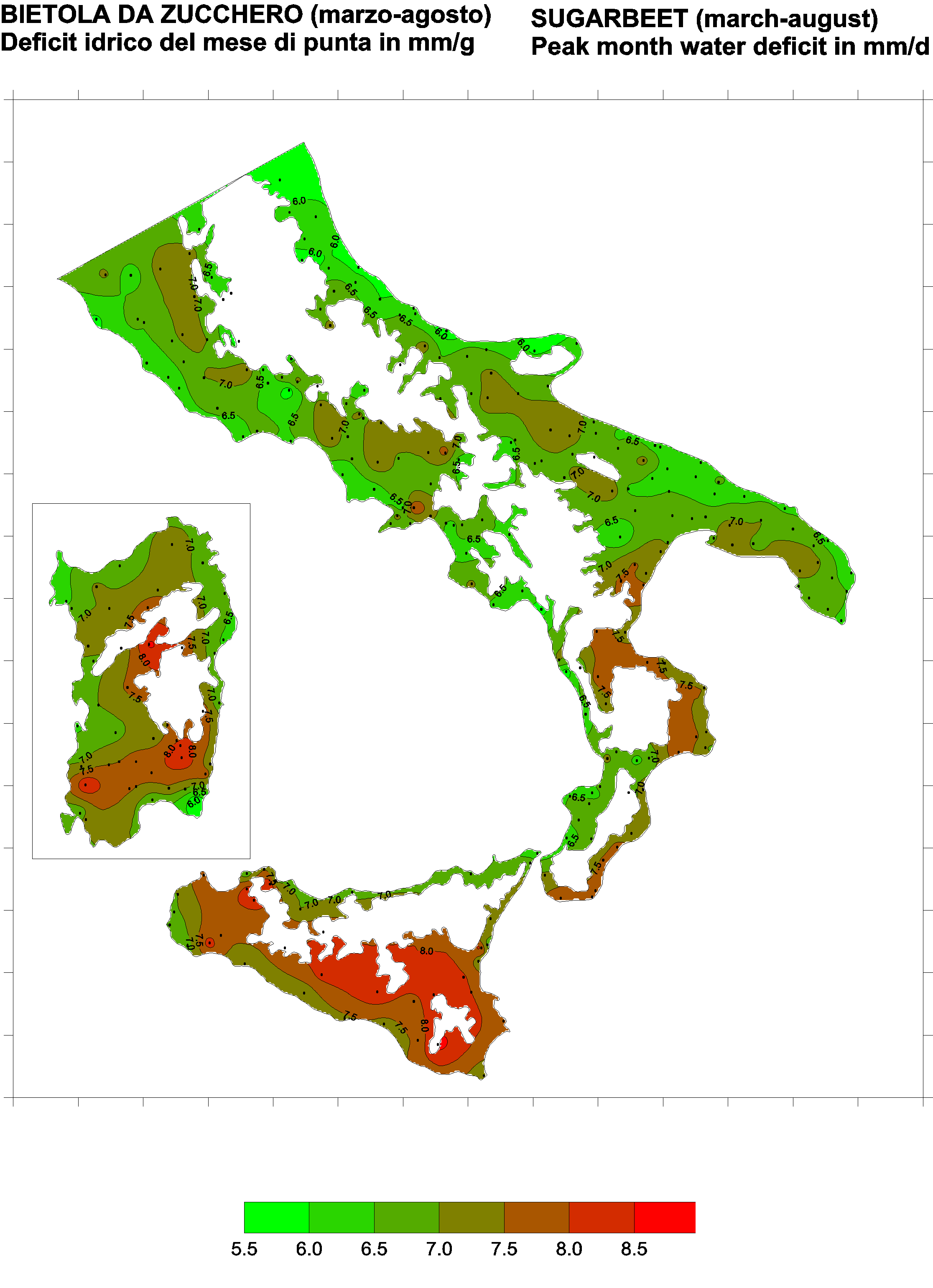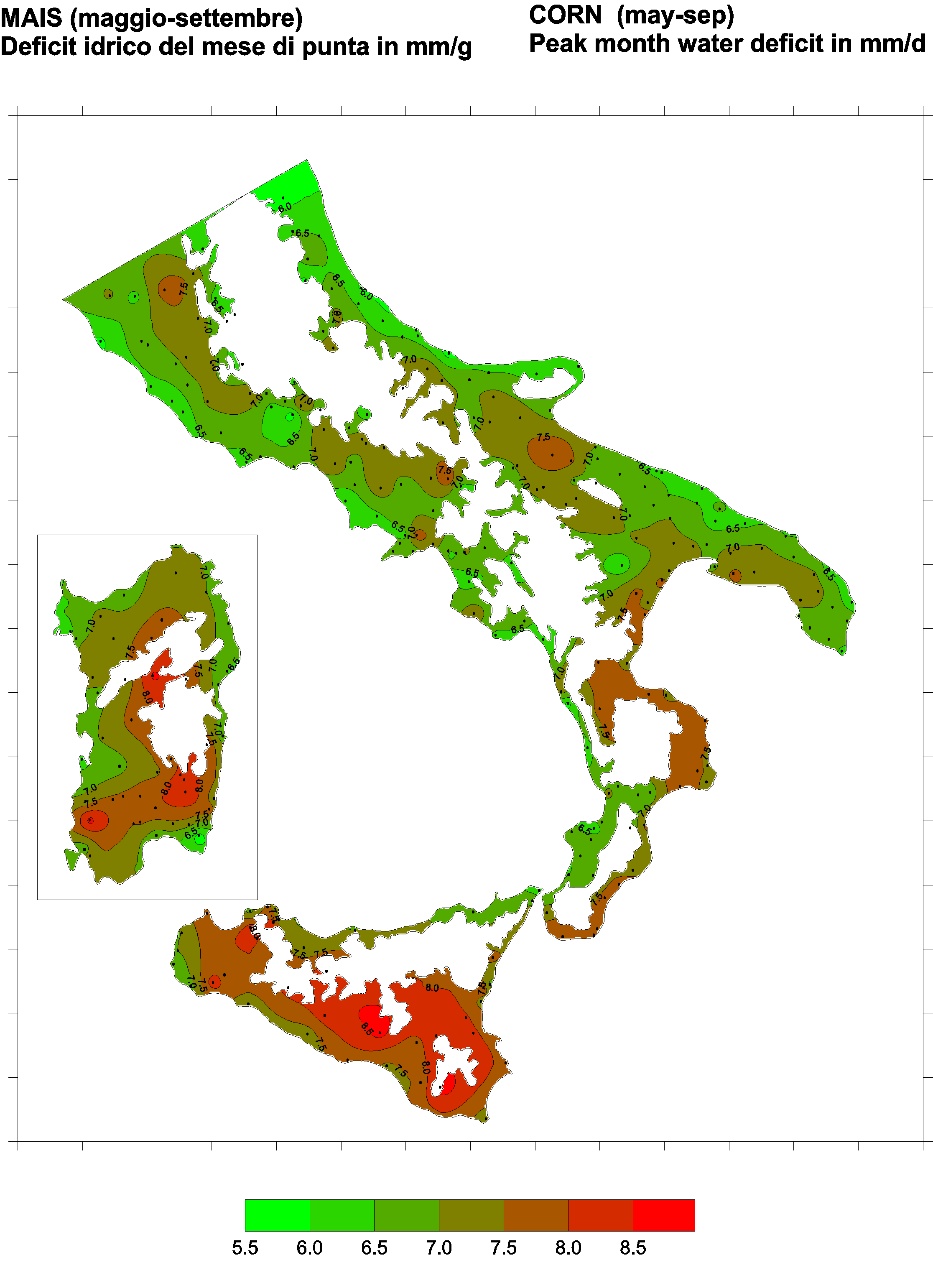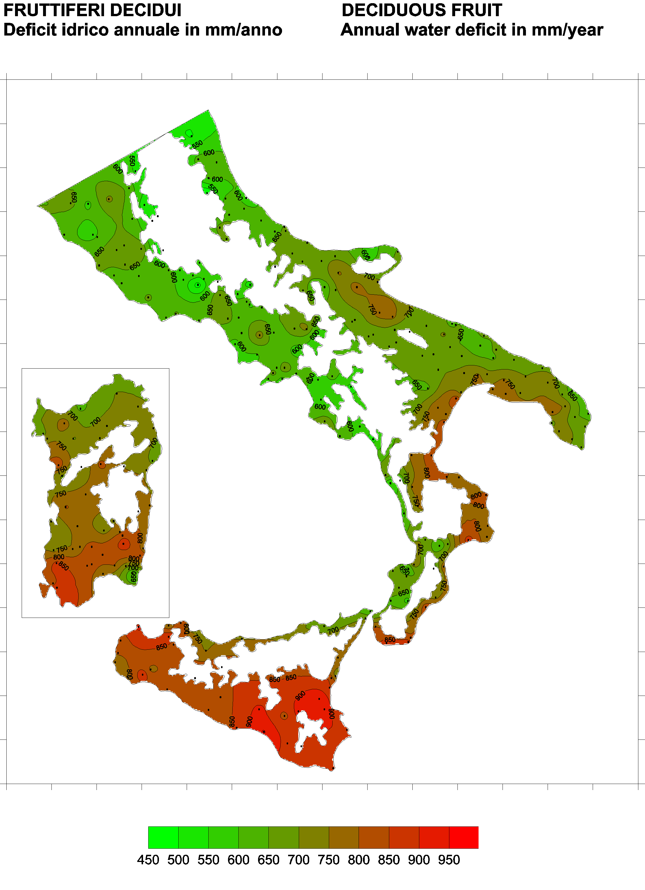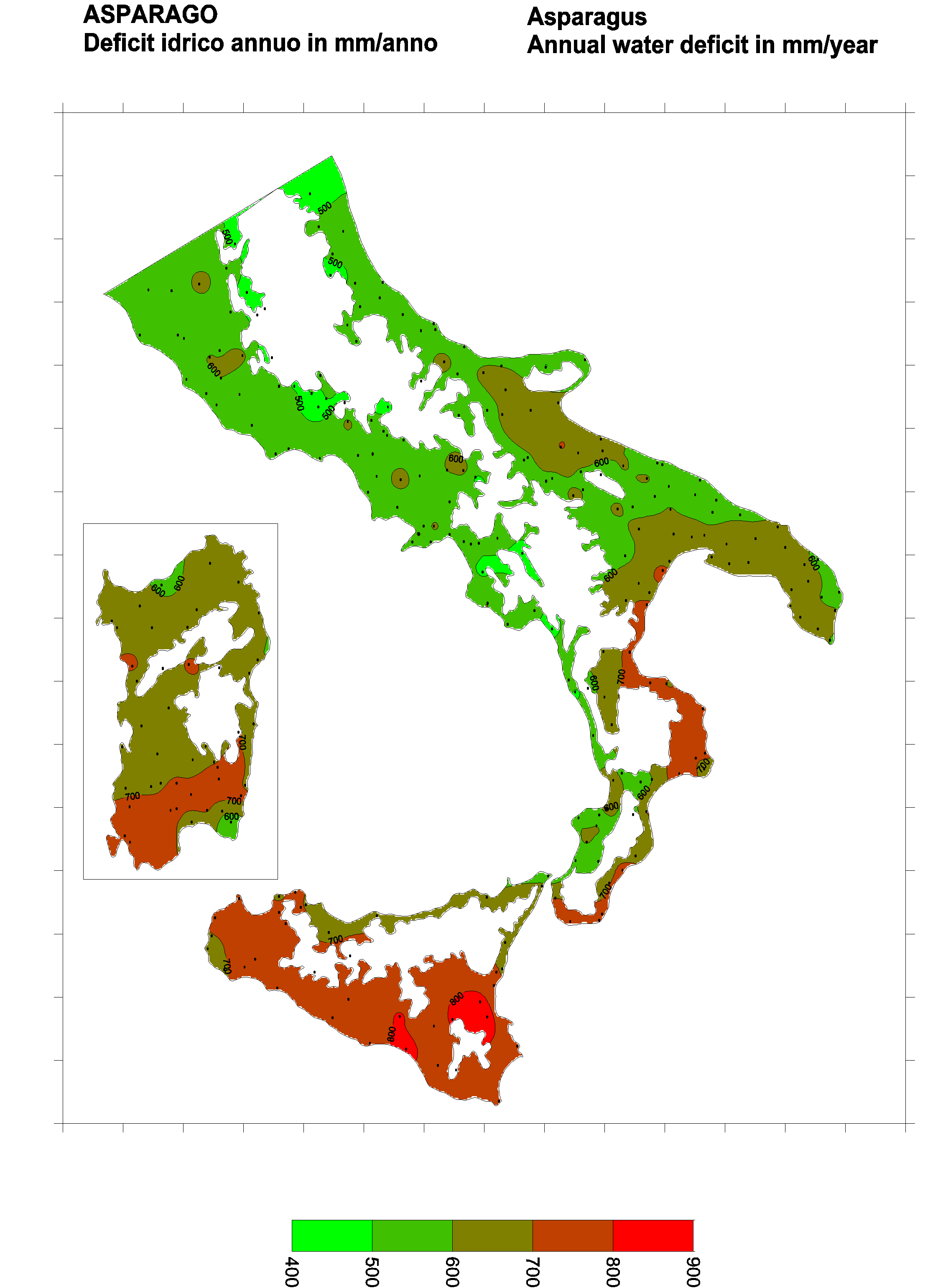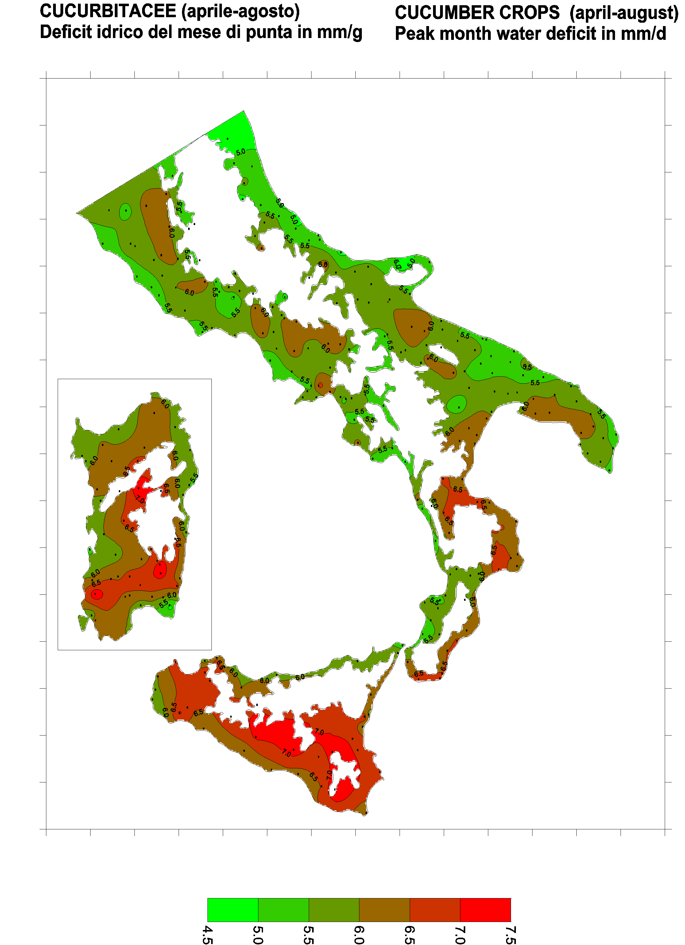The water deficits mapped refer to a selection of crops cultivated in the periods of the year typical of Southern Italy. Deficits may vary considerably according to different periods and cultivation criteria.